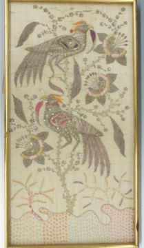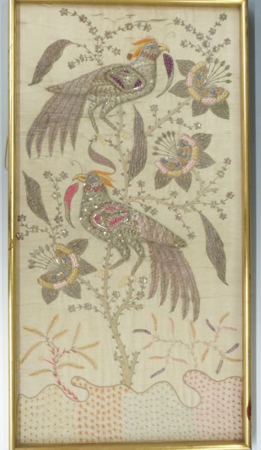 Gold thread and beadwork tapestry depicting birds of paradise, 100 x 53cm, framed and glazed