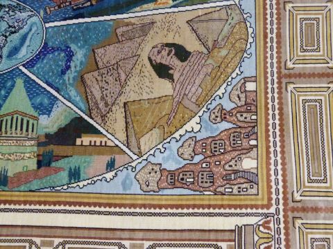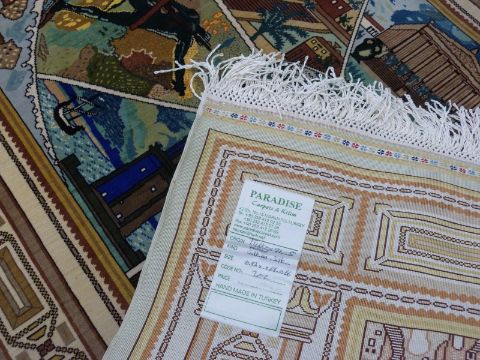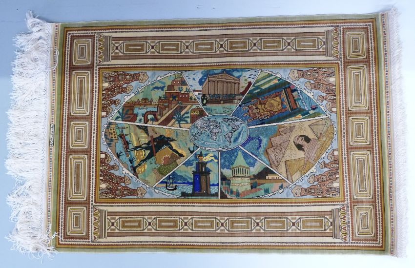 Turkish Hereke Turkish rug with central seven wonders of the world design, 100 x 68cm.