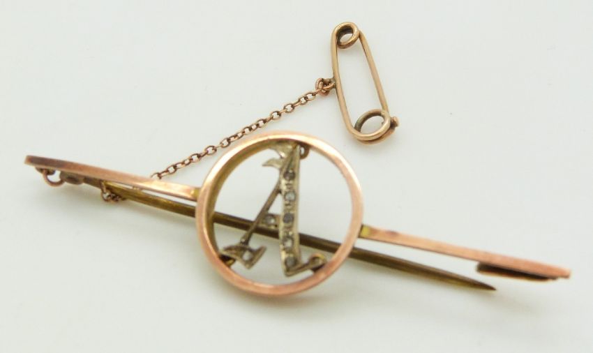 Victorian 9ct gold brooch set with diamonds in a letter 'A', in Bravingtons box, 3.1g