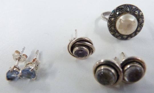 A silver necklace, two coral necklaces, silver bracelet, silver earrings etc