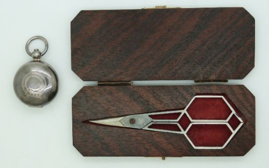 A pair of Art Deco scissors in bespoke rosewood box and silver plated sovereign case.