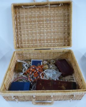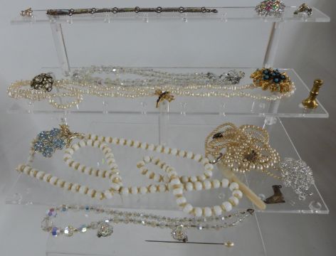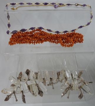 A collection of costume jewellery including gold plated necklace, Art Deco necklace, amethyst pendant, amethyst and pearl necklace, coral, paste, large quartz necklace etc