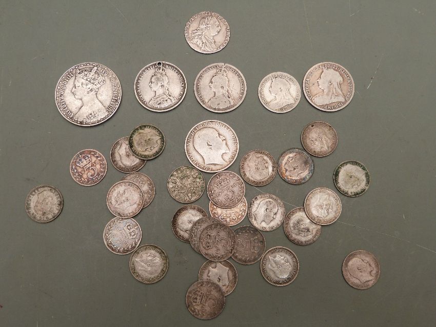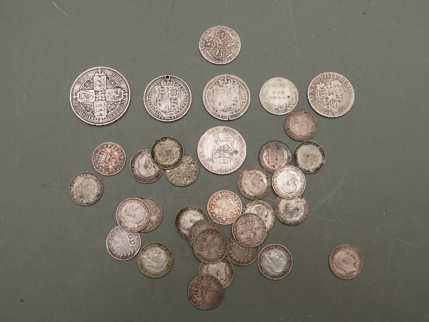 A collection of silver UK coinage including George III sixpence with semee of hearts 1787, Victorian Gothic florin 1883, Victoria shillings, Edward VII shilling etc, together with a collection of pre and post 1920 threepences