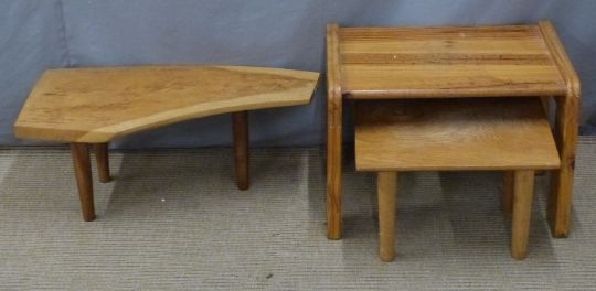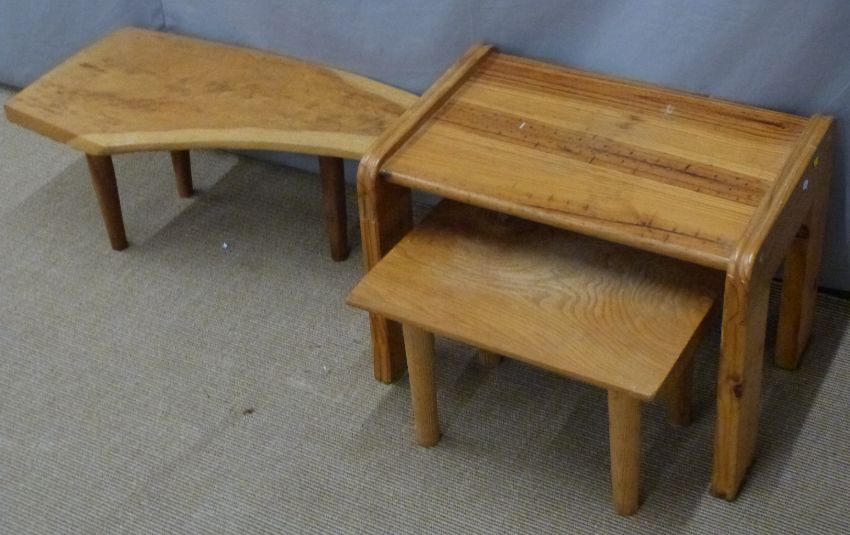 Elm coffee/side table, a pine retro table and a three legged side table length 71cm