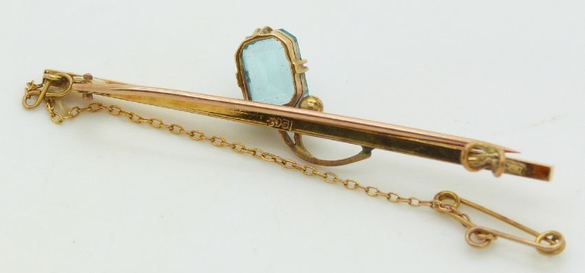 A 15ct gold brooch set with an emerald cut aquamarine, length 5cm