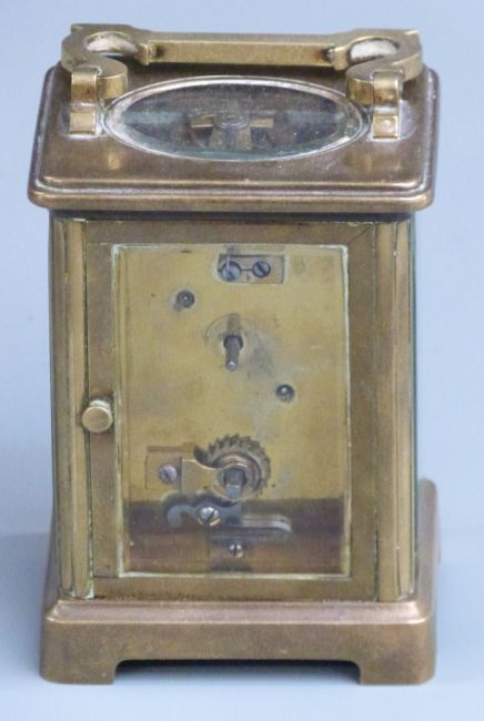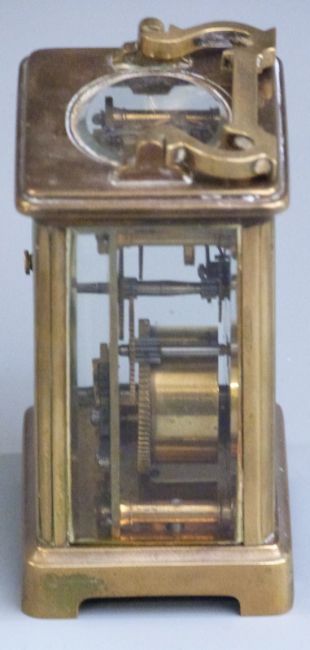 Carriage clock in brass corniche style case, enamel Roman dial with blued steel hands, 11cm tall