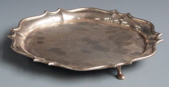 Edward VII hallmarked silver salver with shaped edge and raised on three feet, London 1909 maker Gorham Manufacturing Co, diameter 26cm weight 555g