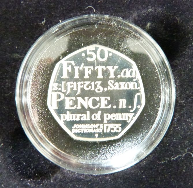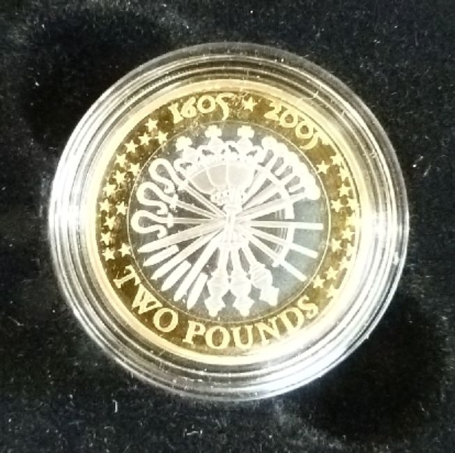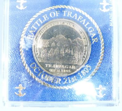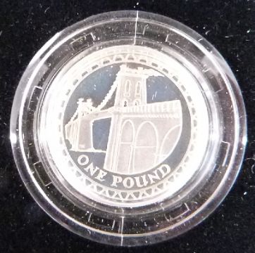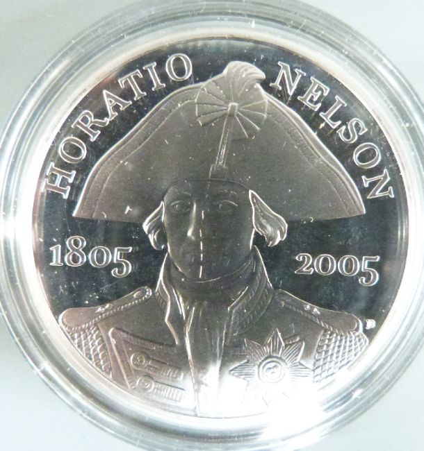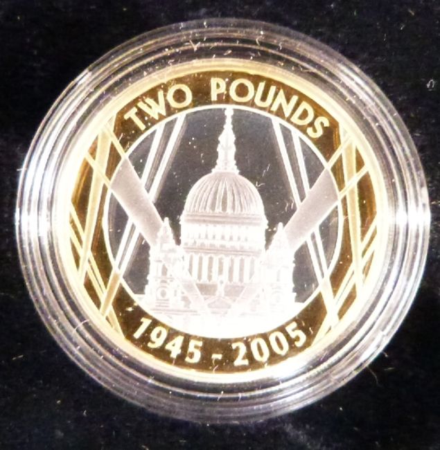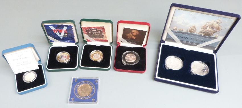 2005 Royal Mint silver proof cased coins comprising Nelson £2 coin Battle of Trafalgar, Gunpowder Plot £2, WWII £2, Samuel Johnson fifty pence, Menai Bridge £1 together with a further Trafalgar coin