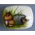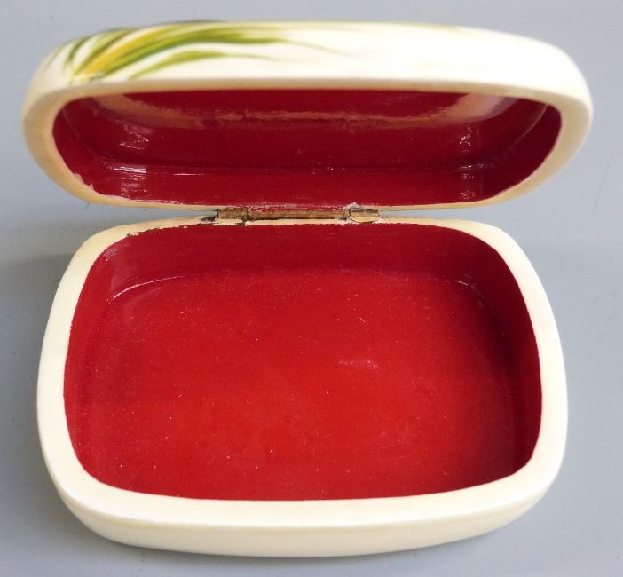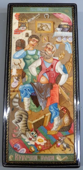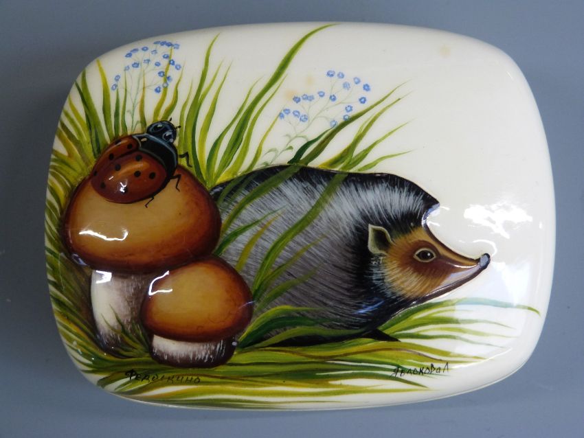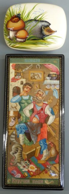 Two Russian lacquer boxes, one depicting hedgehog, mushroom and ladybird signed (approximately 8.5cm x 6.5cm x 3cm) and one with a domestic scene (approximately 18cm x 8cm x 2cm).
