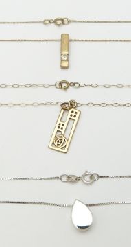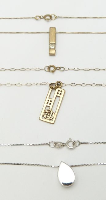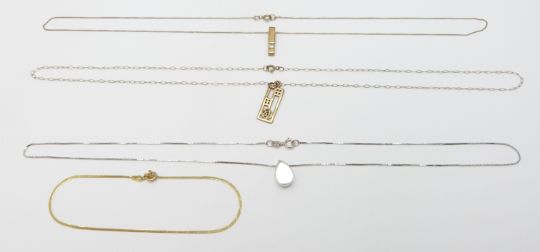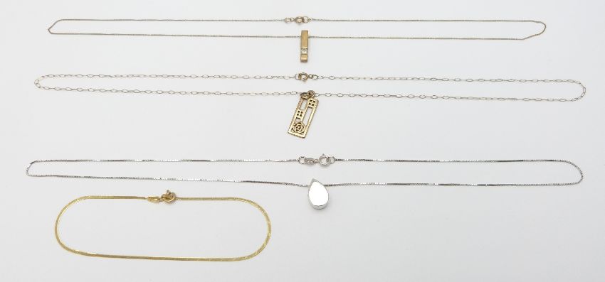 Two 9ct gold pendants and chains, a 9ct white gold necklace and a 9ct gold bracelet, 4.5g