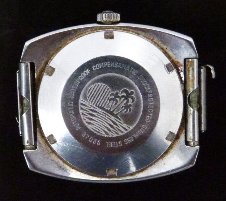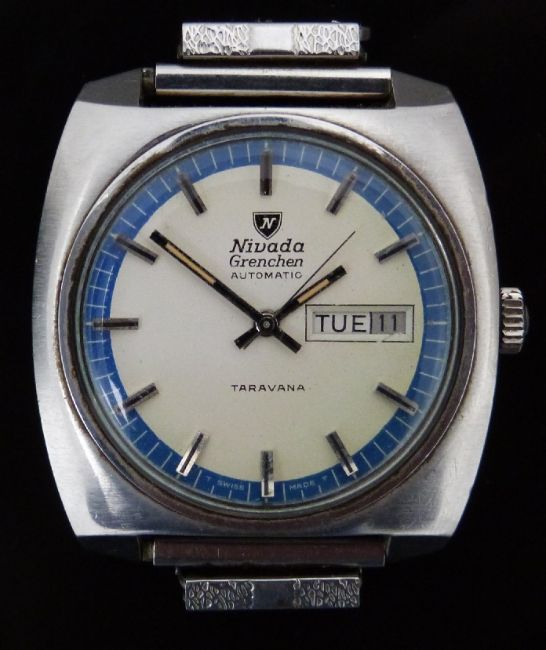 Nivada Taravana gentleman's automatic wristwatch with day and date aperture, luminous hands, two-tone baton markers, blue minute track, cream dial, stainless steel case and ETA caibre 2789 movement, on expanding metal bracelet, case diameter 39mm, serial number 67035.