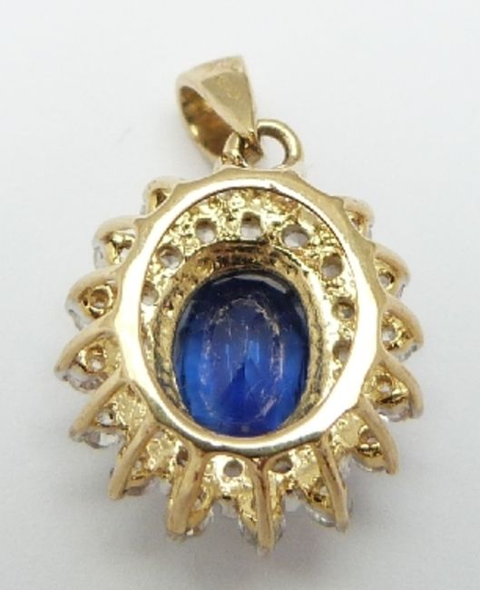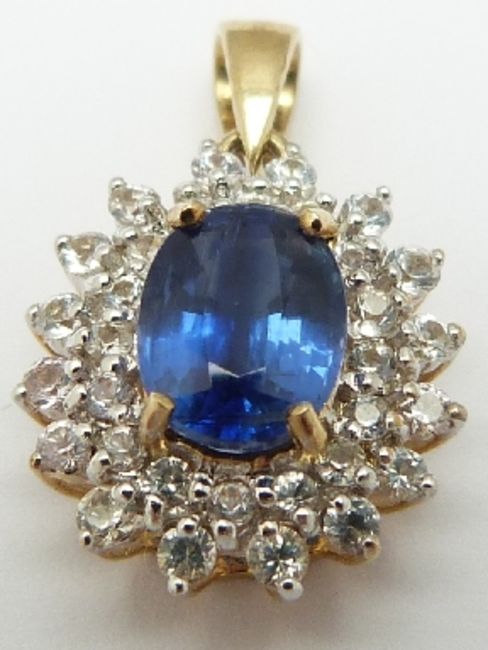 A 9ct gold pendant set with an oval cut kyanite surrounded by diamonds