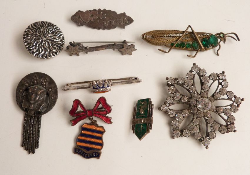 Costume jewellery including hardstone carvings, silver brooches, filigree brooch, silver etc
