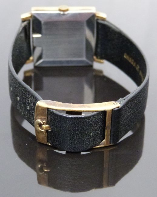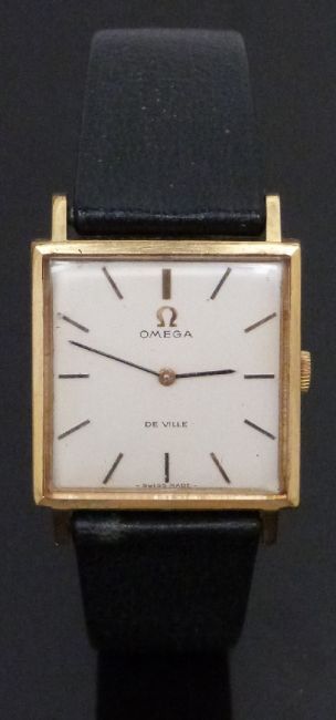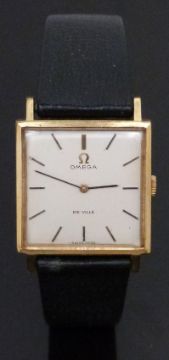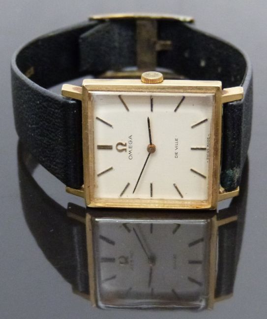 Omega De Ville gentleman's wristwatch ref. 111.071 with black hands and baton markers, square silver dial, gold plated case and signed 17 jewel calibre 620 movement, on black leather strap, case diameter 26mm, serial number 33422213.
