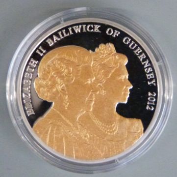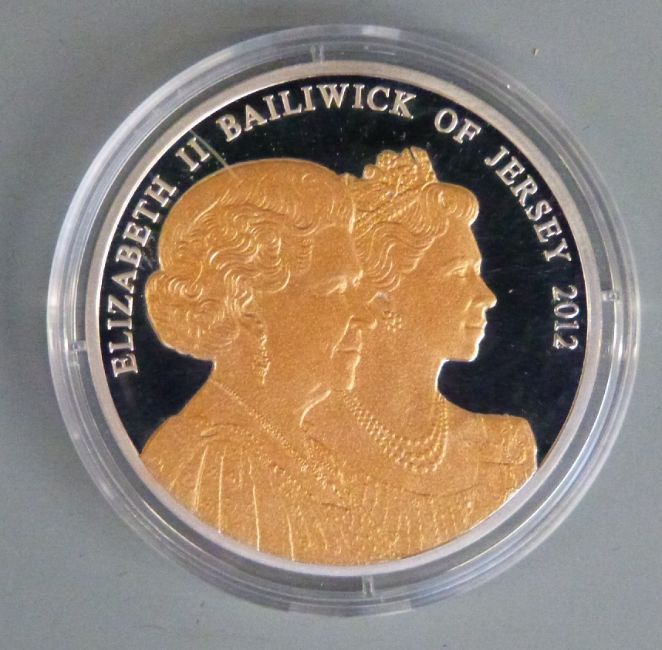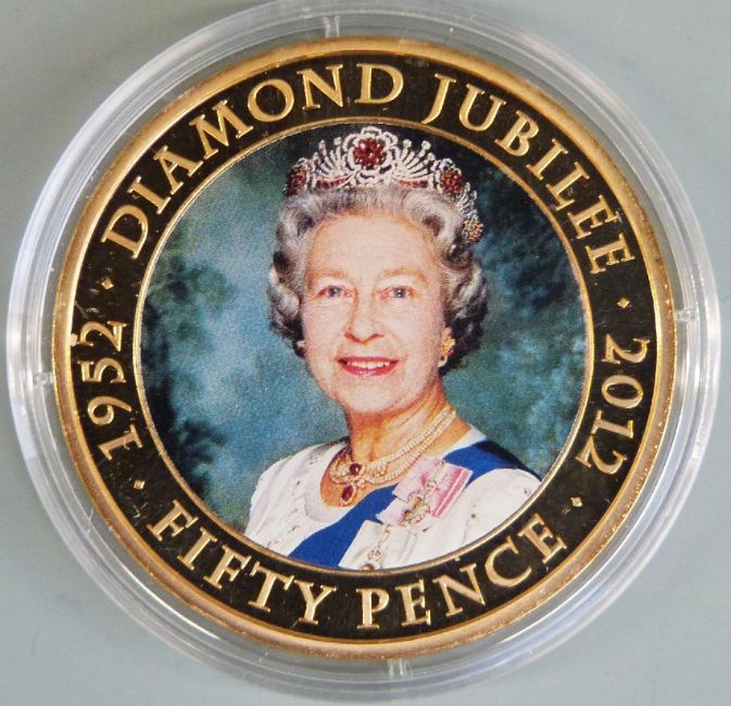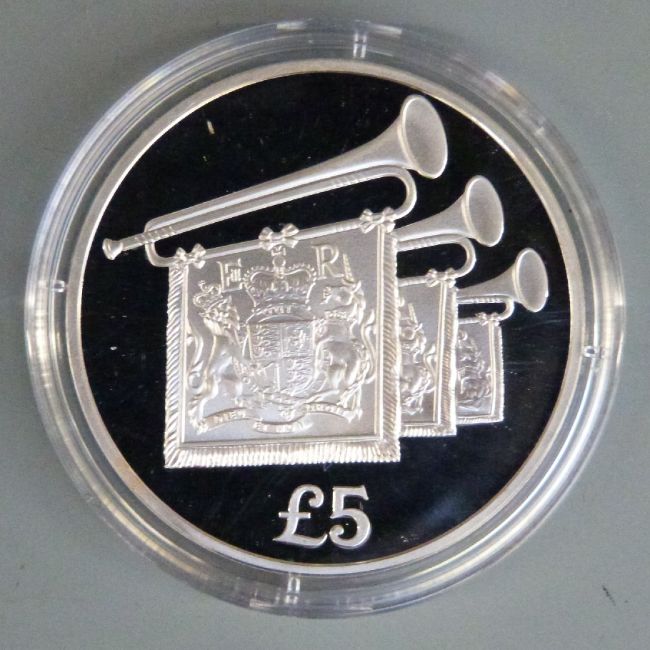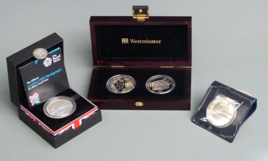 Three silver £5 coins and a 2012 diamond jubilee portrait coin