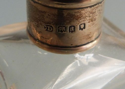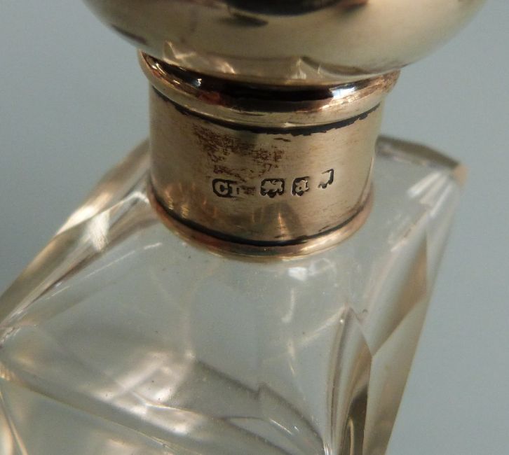 Pair of George V hallmarked silver topped dressing table scent bottles, London 1916 maker Charles Henry Dumenil, height 10cm
