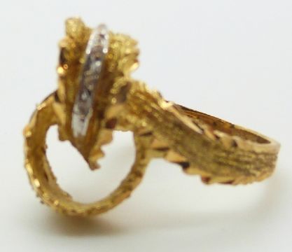 A yellow metal ring in a textured knot design, size M, 6.8g.
