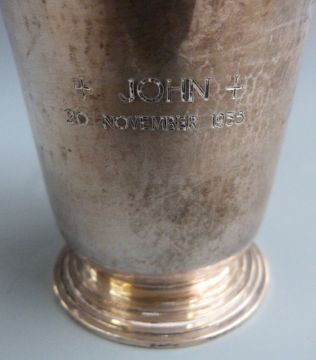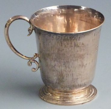 George V Reynell Oswald Huyshe Arts and Crafts hallmarked silver cup with hammered finish, London 1935, height 8.5cm weight 165g