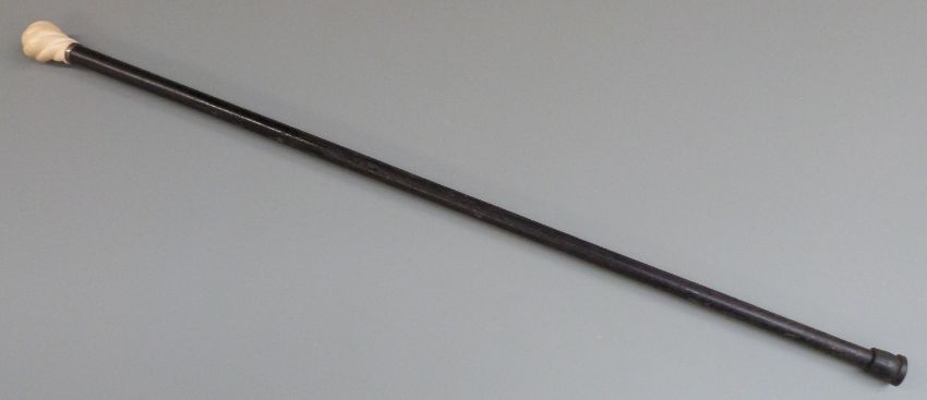 19th/20thC walking stick with wrythen ivory knop handle and white metal collar marked '800' length approximately 85cm