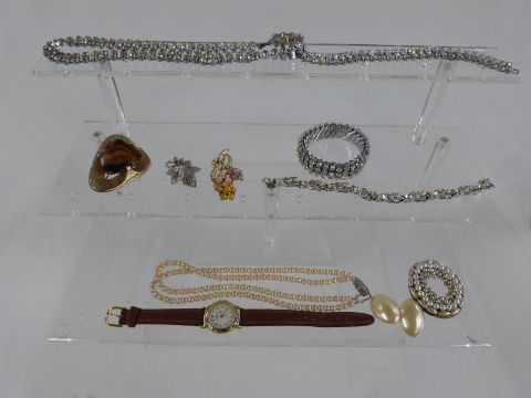 A collection of costume jewellery including beads, brooches, Sphinx brooch, Hollywood brooch, diamanté etc
