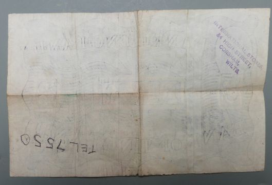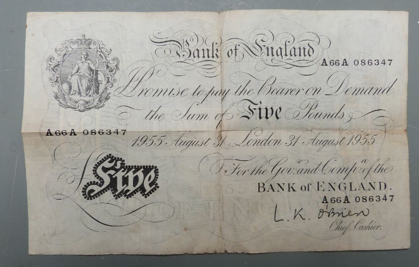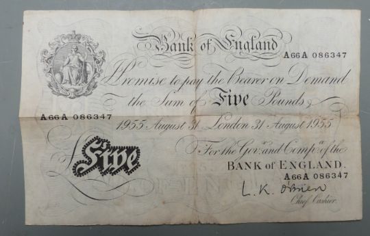 L K O'Brien 1955 white five pound note 31/8/55 no. A 66A 086347, folded, shop stamped verso