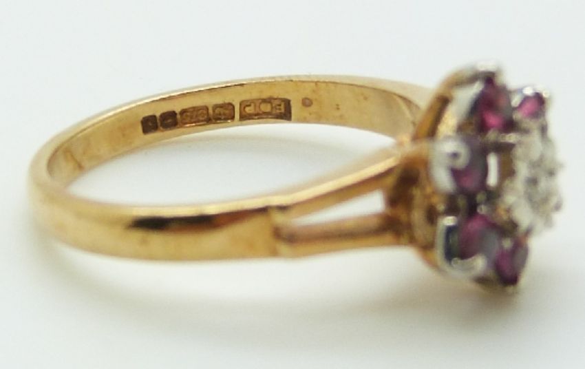 COLLECTING  A 9ct gold ring set with diamond and pink sapphires, 3.2g, size N