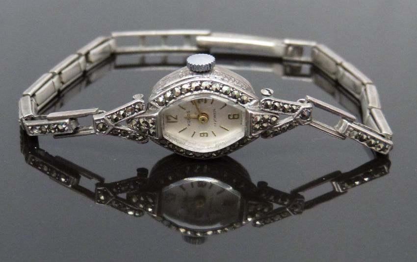 Komos silver and marcasite ladies cocktail watch with gold hands and silver dial, case diameter 15mm