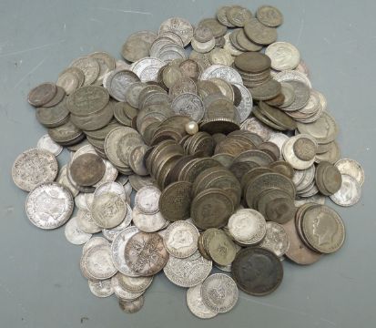 Approximately 2335g of mixed silver coinage, largely UK pre 1947, some pre 1920 and overseas USA etc, in vintage jewellery box.