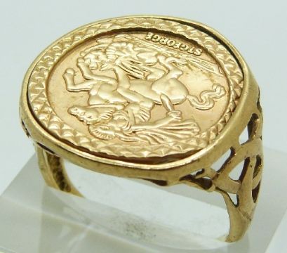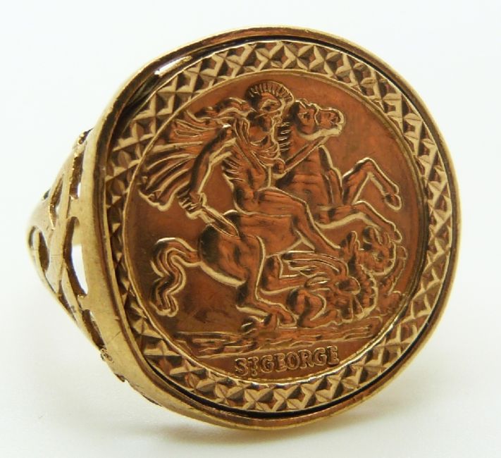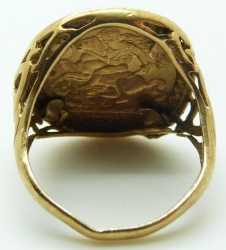 9ct gold ring with faux sovereign face, size T, 3.6g