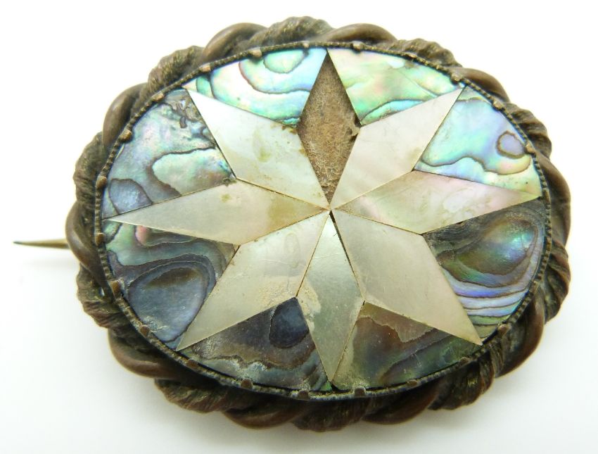 Victorian pinchbeck brooch set with black enamel and banded agate, a horseshoe brooch reading Good Luck and further Victorian brooches