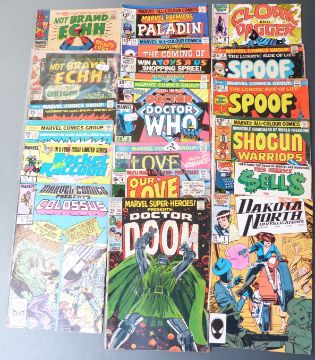 Twenty Marvel comics comprising Not Brand ECHH 6 and 7, Arrgh! 2 and 3, Rocket Raccoon 3, Colossus 12, Cloak and Dagger 8, Spoof 4 and 5, Fred Hembeck Sells 1, Shogun Warriors 9, Dakota North 1, Doctor Doom 20, Our Love Story 6 and 29, Doctor Who 2 and 57, Dominic Fortune 56, The Coming of Caleb Hammer 54 and Paladin 43.