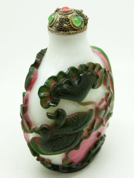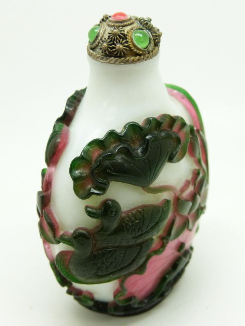 Chinese double glass overlay scent bottle with decoration depicting lily pads and ducks, with filigree stopper, 7cm tall