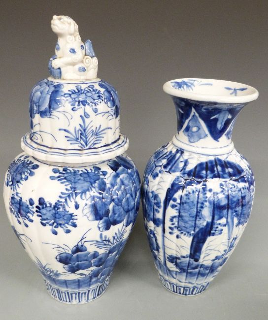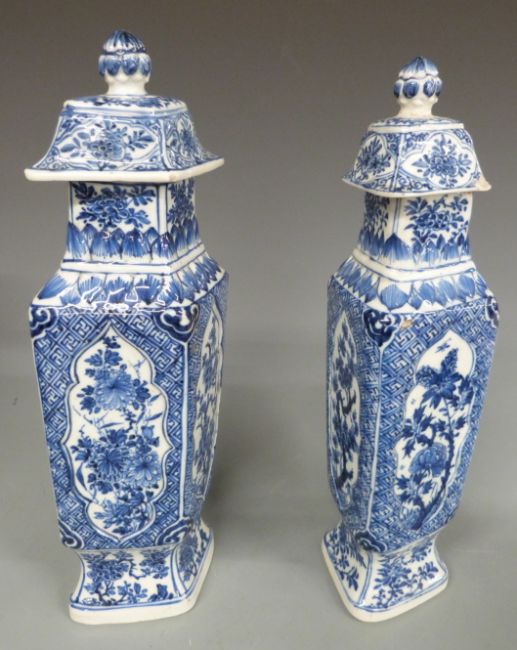 Blue and white ceramics including a pair of covered vases, Delft, German examples etc, tallest 38cm.