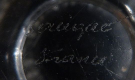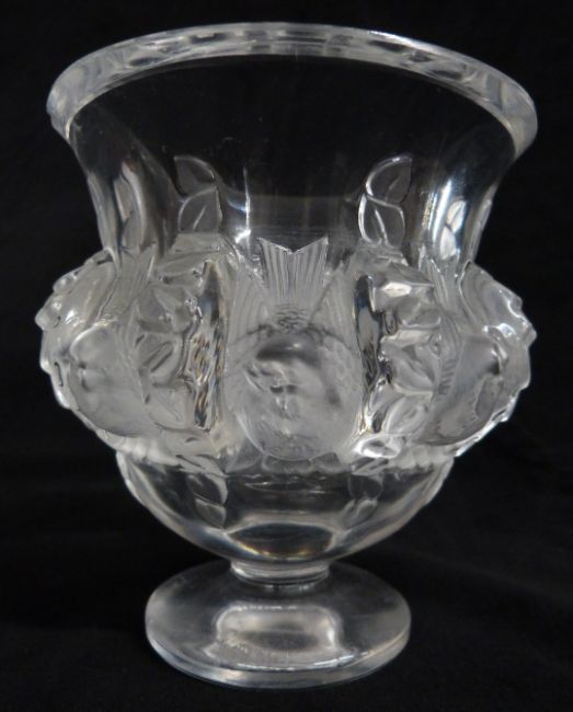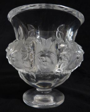 Lalique Dampierre glass vase decorated with sparrows amongst foliage, 12.5cm tall