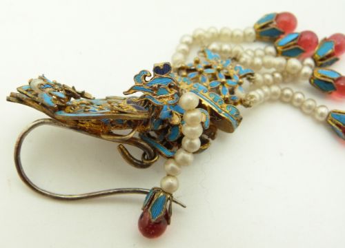 A pair of Chinese silver gilt earrings in the form of a bird and floral decoration set with kingfisher wing, faux pearls and glass drops