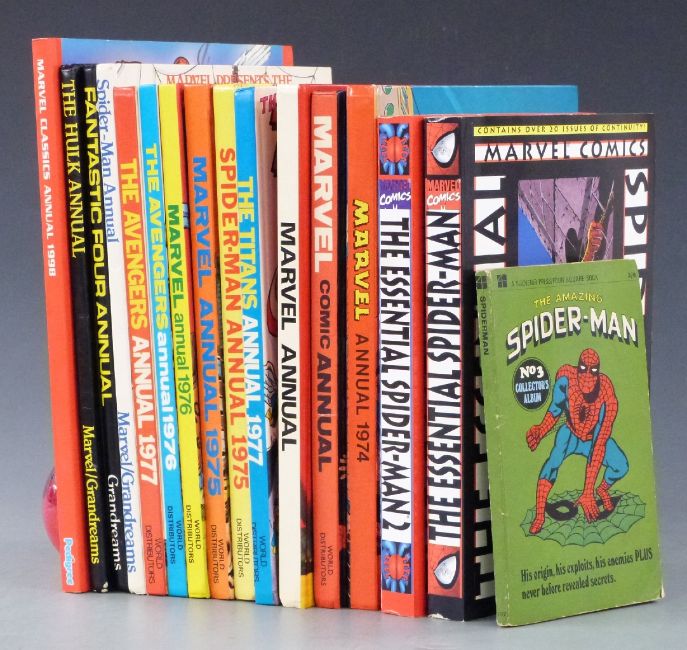 Sixteen Marvel Annuals and Spider-Man comic books including 1974, 1975, 1976, The Essential Spider-Man, The Titans, The Hulk Annual, The Avengers Annual etc.