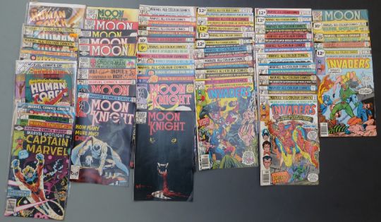 Fifty-four Marvel comics comprising Captain Marvel 1 and 4, Human Torch 2 x2, 3, 5, 8 x2 and one other, The Invaders 1, 3, 5-7, 11, 13, 17-29 and 32-40 and Moon Night 1-3, 13, 14, 20, 21, 23, 24, 26, 27, 28 x3, 29 and 35.