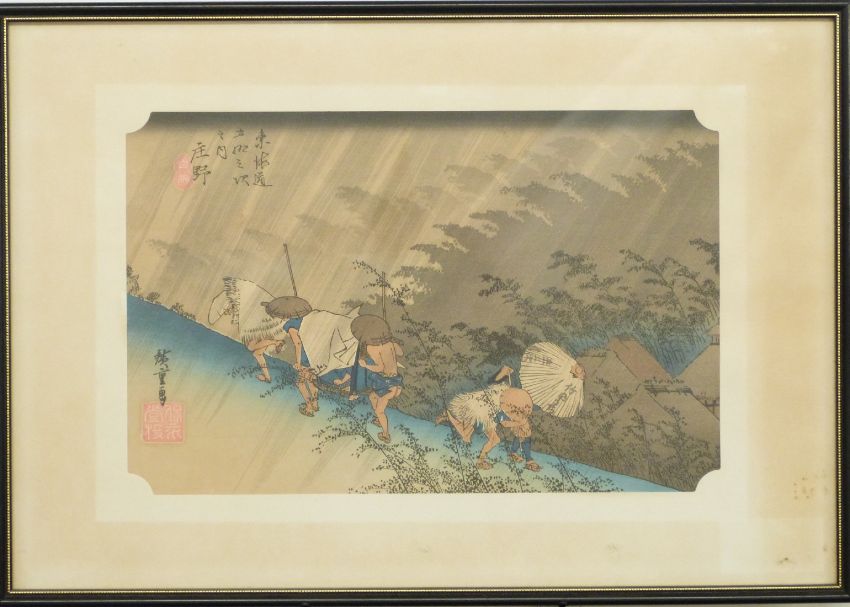 A 19th/20thC Japanese print of travellers on a hillside in a storm, 22 x 34cm