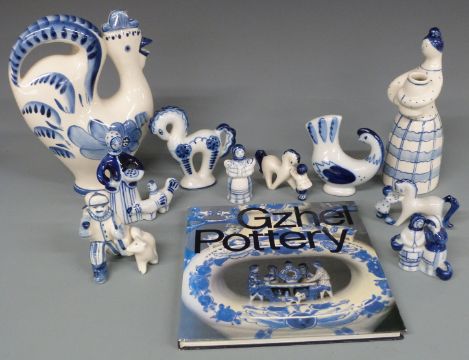A collection of Russian Gzhel pottery with a Gzhel book (10), tallest 23.5cm