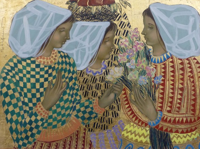 Pre-Raphaelite style mixed media and gilt painting of three women holding flowers, indistinctly signed top left, 59 x 79cm, framed