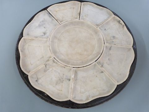 A 19th/ early 20thC Chinese lacquer box decorated with auspicious symbols, with sectional hardstone dishes to interior each signed to base, 45.5cm diameter