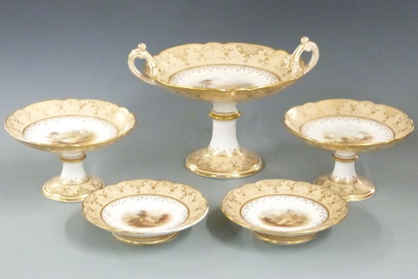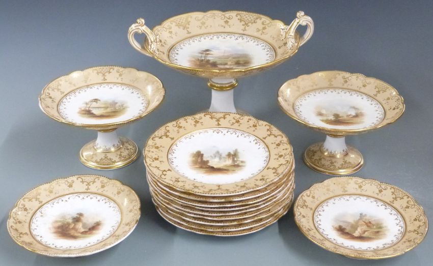 English porcelain dessert service, probably Spode / Coalport, decorated with landscape scenes, approximately 14 pieces