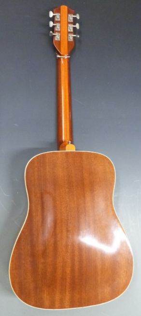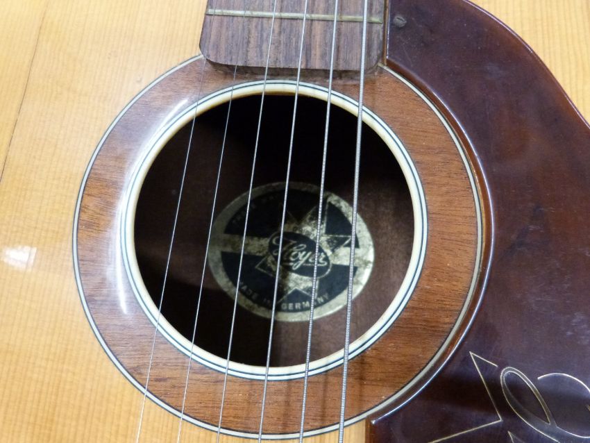 Hoyer acoustic guitar fitted with six steel strings on individual machine heads and semi round back, with soft carry case