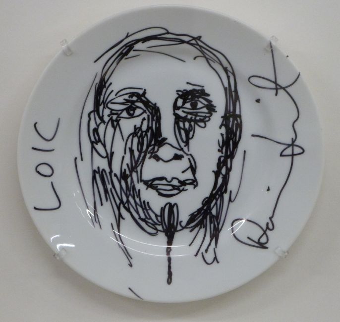 Damien Hirst (b1965) permanent marker on ceramic plate portrait of Loic Bonbonny, who worked for Hirst as a chef and studio assistant circa 2007 to 2015, titled and signed to rim of plate, with letter of provenance from Loic Bonbonny, diameter of plate 19cm