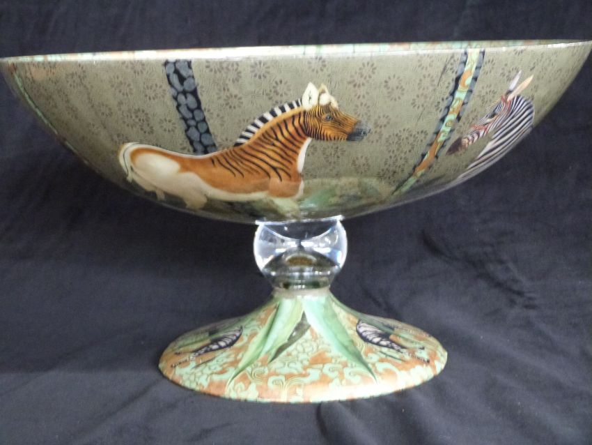 Glass pedestal fruit bowl with rhino and zebra decoration, H20cm, diameter 37cm