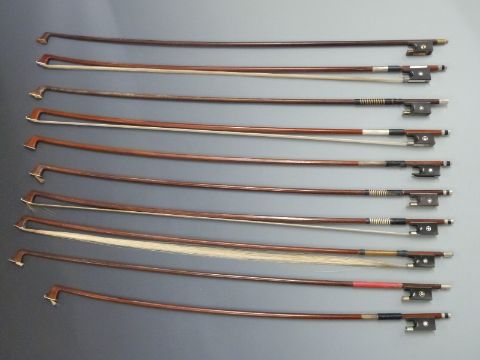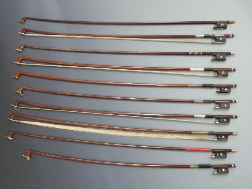Eight round stick violin bows with various button types, together with two octagonal bows, all with Parisian type eyes to frogs