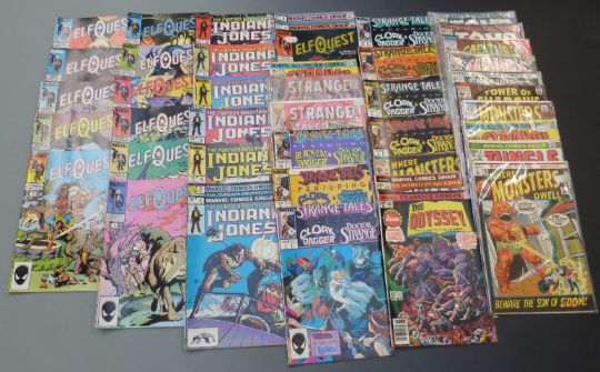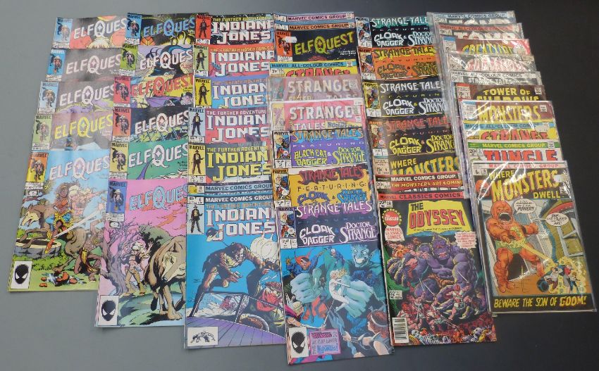 Sixty-one Marvel comics comprising Elf Quest 3, 4, 6, 9, 12, 14, and 16-21, Indiana Jones 4-6, 8, 10, 12, 13, 15 and 18, Strange Tales Featuring Cloak and Dagger & Doctor Strange 3-7, 9 and 10, Strange Tales 131, 134 and 175 x2, Monsters on the Prowl 10, Tower of Shadows 1, 2 and 6, Golem 177, Creatures On The Loose 10, 11 and 19 Tomb Of Darkness 16 and 18, The Odyssey 18, Beware 7, Where Monsters Dwell 8, 9, 16, 19 x2, 20-23, 26, 30, 32 x3, 34 and 37 and Jungle Action 3.
