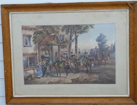 Orlando Norrie (1832-1901), watercolour of 18th Royal Hussars being served drinks outside an inn, signed lower left, 32 x 49cm, framed and glazed