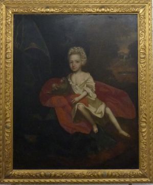 18thC / 19thC oil on canvas of Ann Savage (1745-1816) with her adult head on a child's body. Ann Savage married Sir Thomas Crawley Boevey who inherited Flaxley Abbey in the Forest of Dean, Gloucestershire, the vendor is a direct decedent of the sitter. 124 x 101cm, in ornate gilt frame