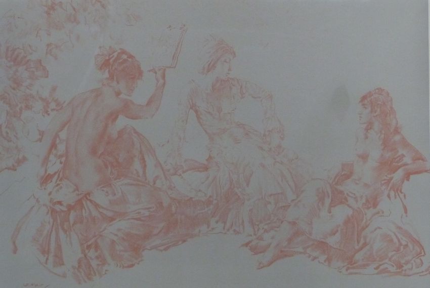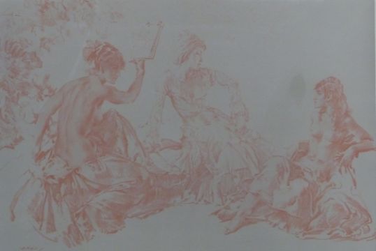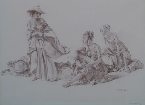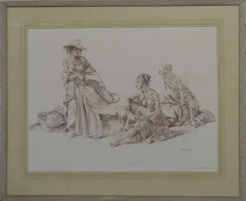 Two signed William Russell Flint RA (1880-1969) prints with blind stamp bottom left, one nude ladies scene, 45 x 66 cm, the other ladies with basket outdoor scene, 51 x 68 cm, both framed and glazed
